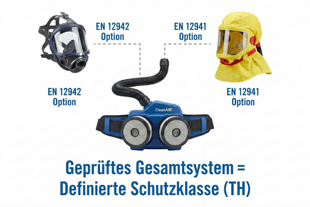 Ob EN 12941 oder EN 12942 relevant ist, hängt u. a. davon ab, ob das System mit Haube/Helm oder mit dicht sitzender Maske betrieben wird.